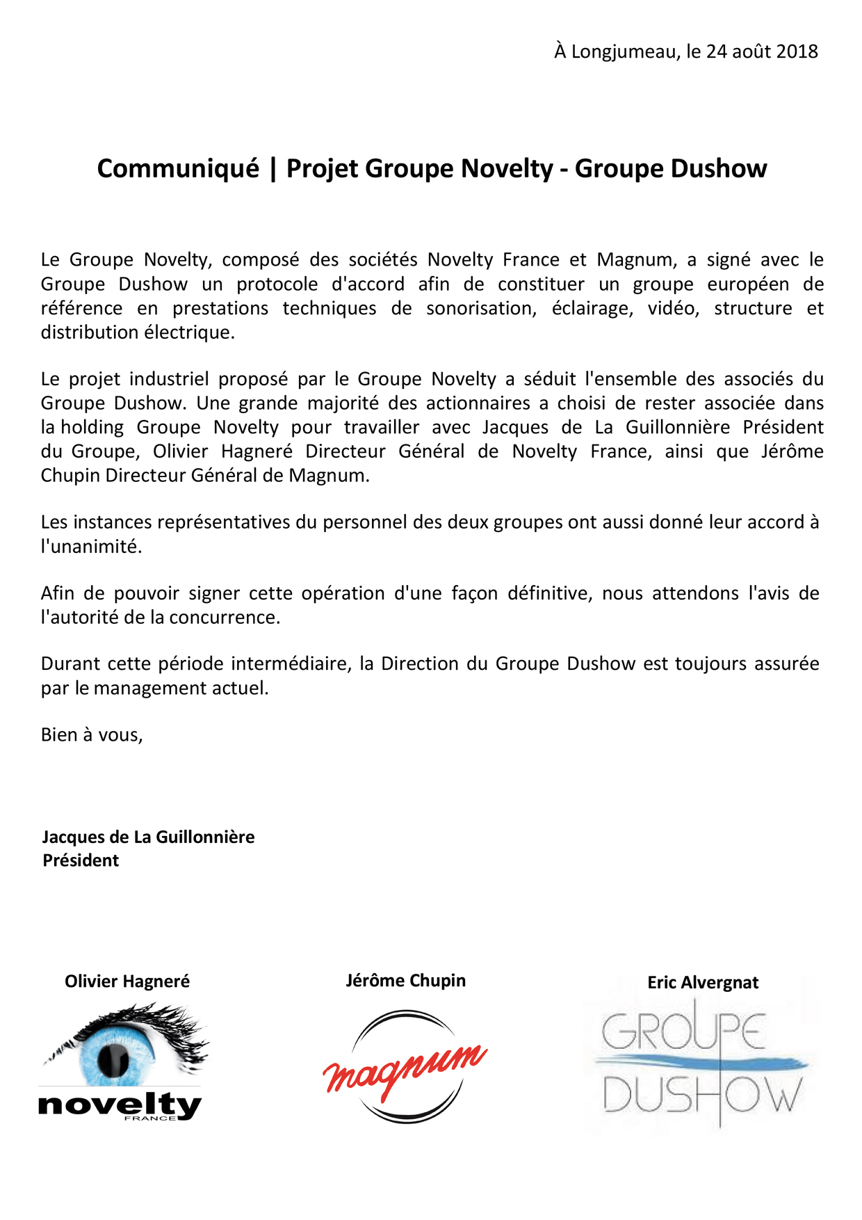 Le Groupe Novelty, composé des sociétés Novelty France et Magnum, a signé avec le Groupe Dushow un protocole d’accord afin de constituer un groupe européen de référence en prestations techniques de sonorisation, éclairage, vidéo, structure et distribution électrique.